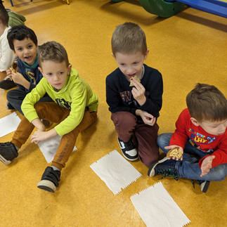 Les MS/GS ont eu la chance de réaliser la pâte avec Tiffany la cantinière, les GS ont cuit les crêpes et les 3 classes les ont dégustées puis ont chantonné et mimé :